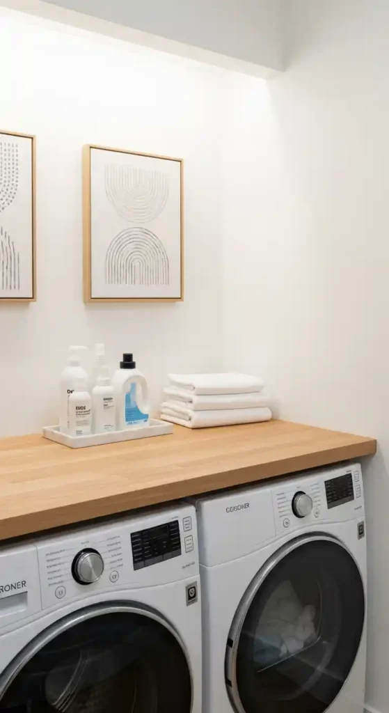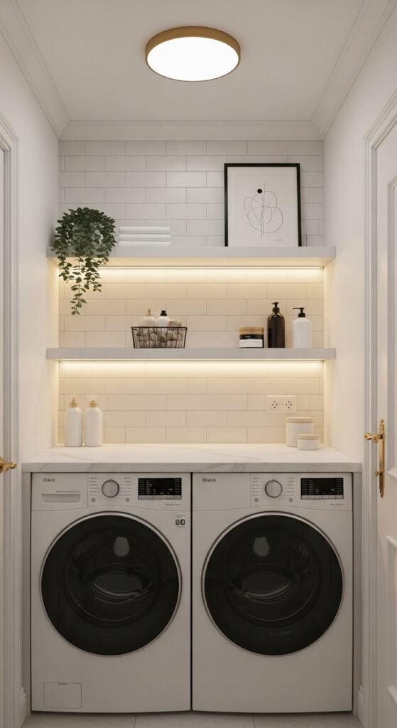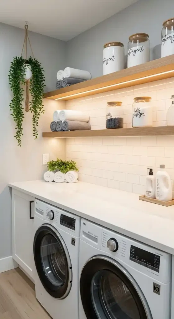 Floating shelves or slim cabinets can hold detergent, fabric softener, and cleaning tools.