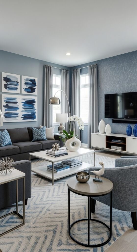Silver, gold, or brass decor pieces elevate blue grey tones, adding elegance and visual contrast.