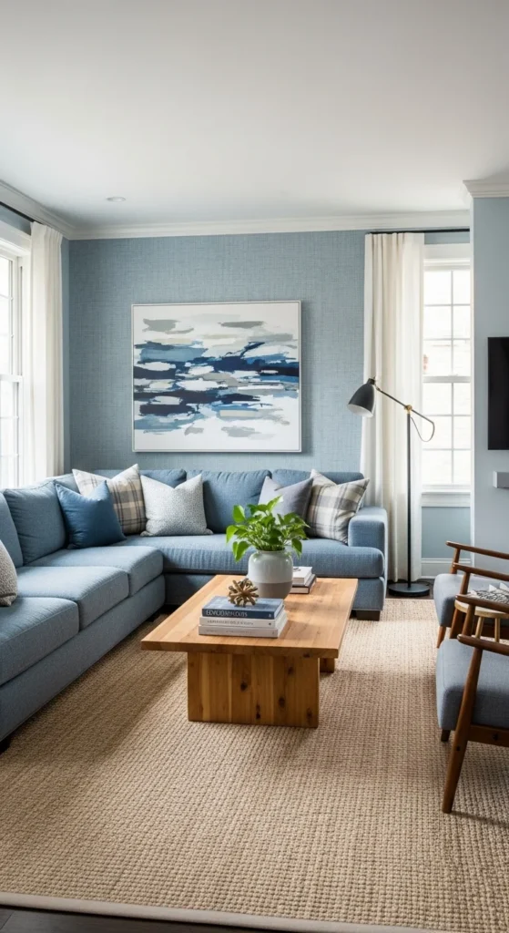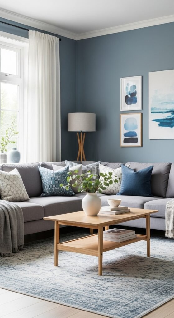 Anchor your space with a single blue grey wall behind the sofa. It adds depth and creates a relaxing backdrop.