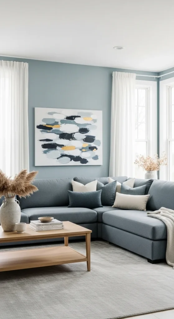 Bold black-and-white or metallic art contrasts beautifully against muted blue grey walls.